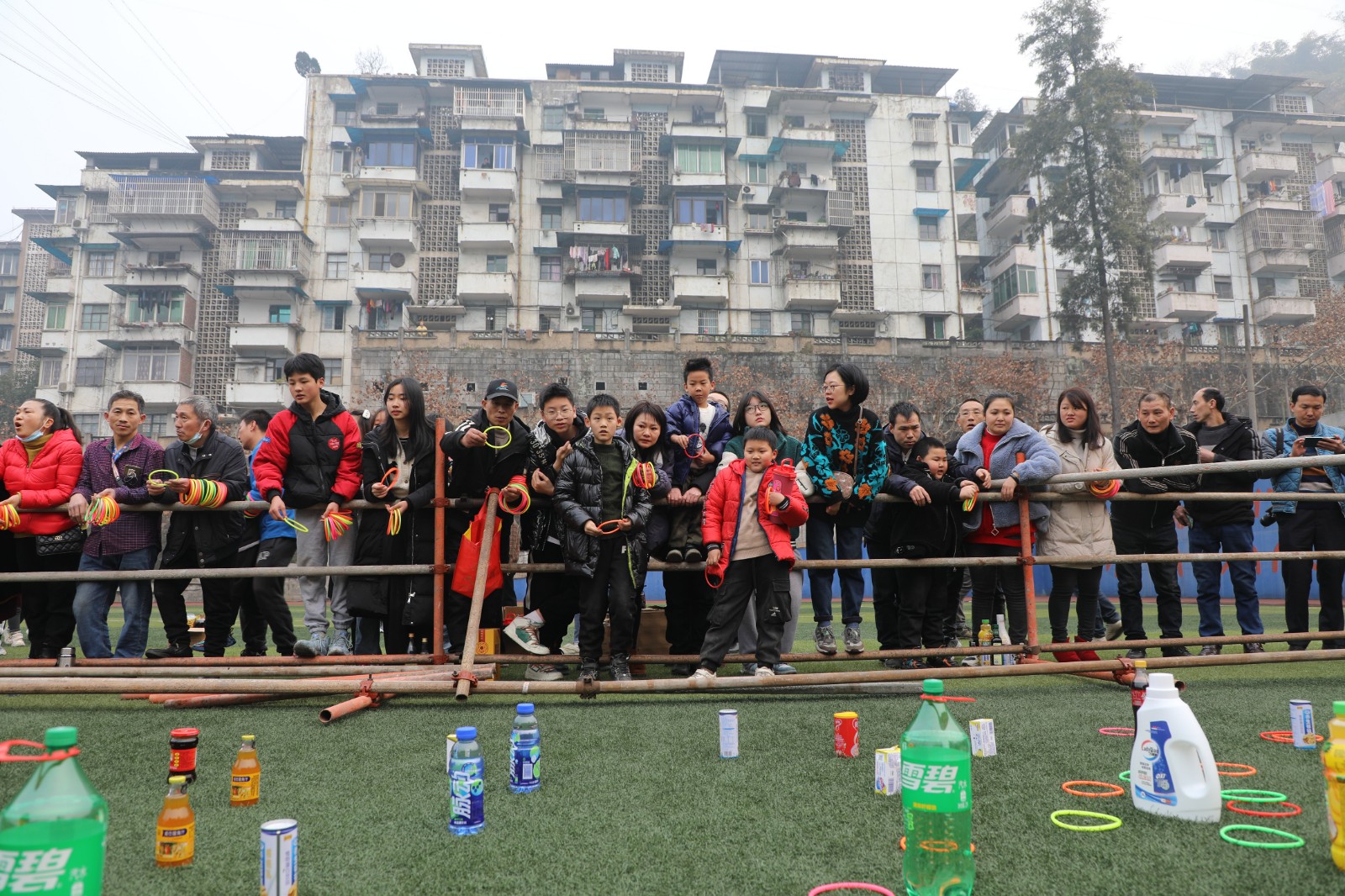 “实物套圈”与“贰柒拾”争霸在官斗山足球场同步举行,职工们携妻带子来到矿区运气。长方形的运动现场围了个里三层外三层,期待“出击”的眷属们,在彩圈售卖处排起的长龙绕了两道弯。凝思聚气、预估距离,屏住呼吸、瞄准目的,转下手腕、用力一挥,天空中快速闪过一道道漂亮的抛物线。有套中目的丰收喜悦的欢呼,有擦肩而过的叹息与加油。套上三两瓶好酒,回家过个热闹年,无论老小,眼里都是希望。